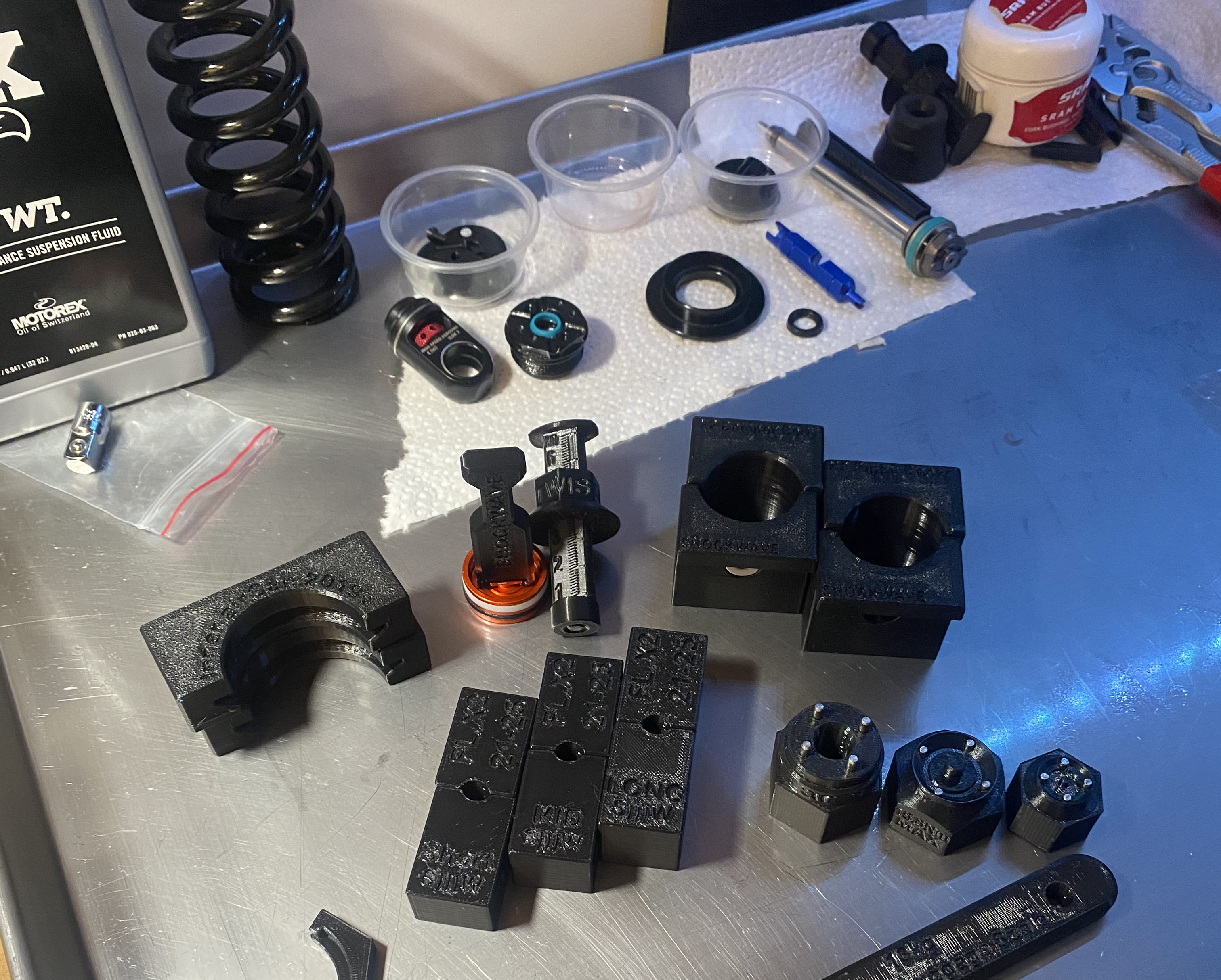 We buy used forks and shocks online, rebuild them, and service our own bikes and friend's bikes all to learn and improve our tools. We can't just copy metal tools, anyway we can't afford to buy them. Ours are plastic, so they have to be designed smarter because there is no room for error.