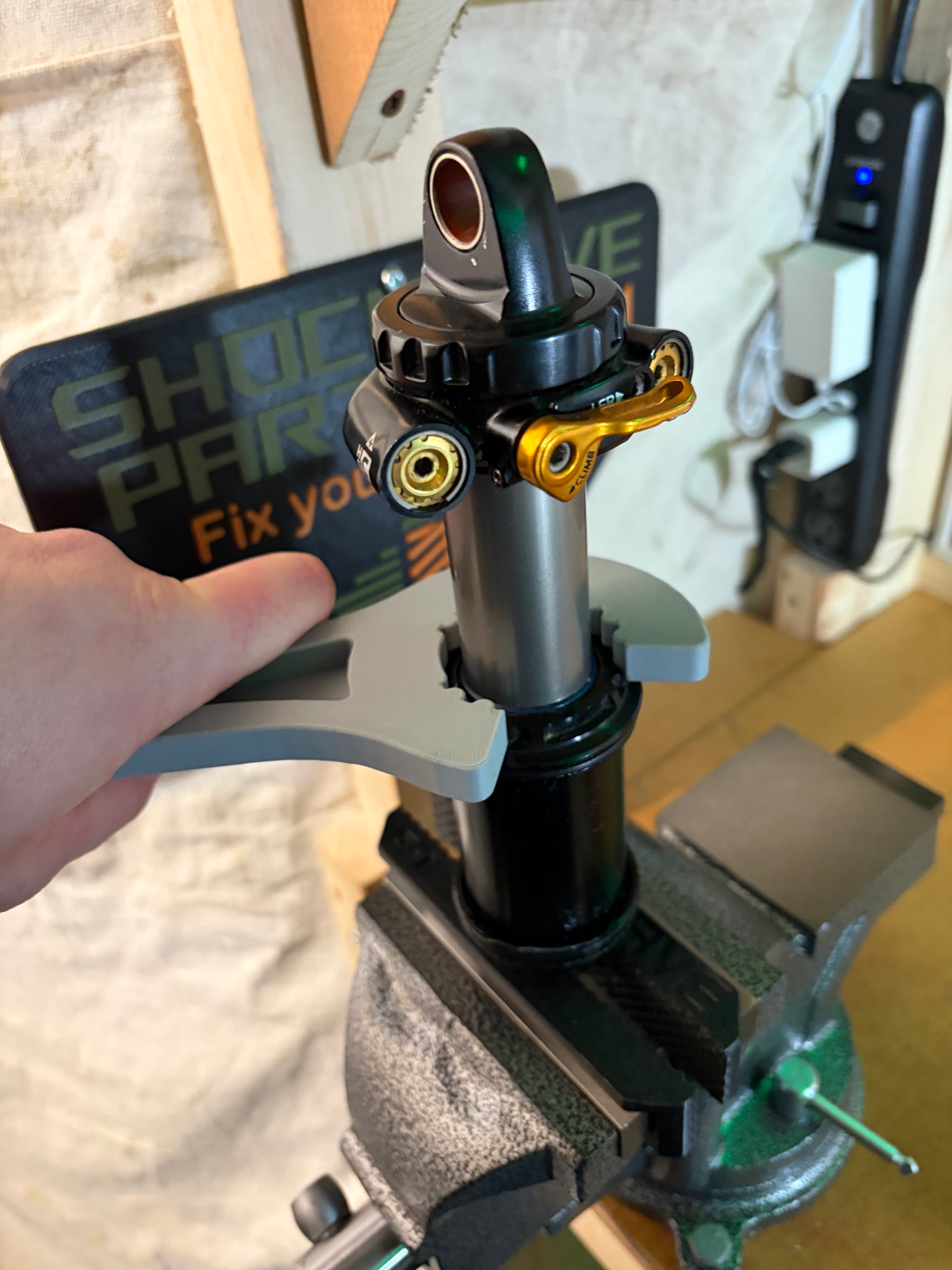 To open the bladder safely, you must use the DB Inline Air Damper Body Clamp . This clamp holds the shock body in a vise without crushing or deforming it.